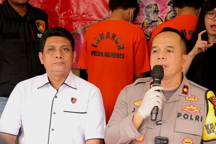 Kapolsek Kalideres Kompol Abdul Jana didampingi Kanit Reserse dan Kriminal AKP Aep Haryaman tengah memberikan keterangan pers (Konferensi Pers) kepada wartawan di Mapolse Kalideres, Rabu (24/7/2024). Foto/Istimewa