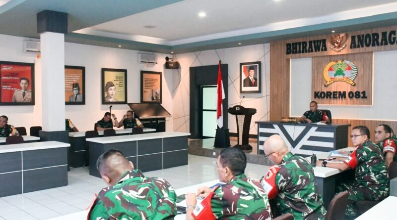 MADIUN – Memasuki hari ke-2 Latihan Posko I yang diselenggarakan di Makorem 081/DSJ, Jl. Pahlawan No. 50 Kota Madiun, Rabu (10/9/2025), unsur komando dan staf Korem 081/DSJ diuji dalam simulasi penanganan gempa yang berpusat di Samudera Pasifik.