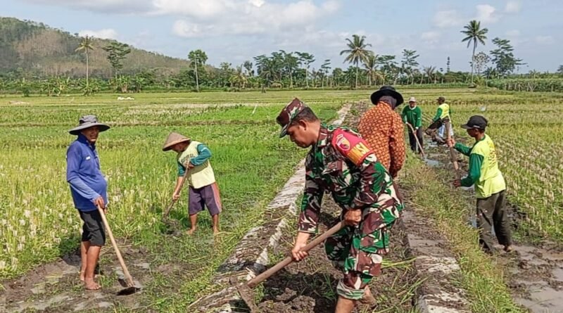 BLITAR – Babinsa Desa Margomulyo Koramil 0808/18 Panggungrejo Sertu Harno bersama masyarakat melaksanakan kegiatan gotong royong penimbunan jalan di area pertanian bertempat di Dusun Margomulyo RT. 01 RW. 02 Desa Margomulyo Kecamatan Panggungrejo, Sabtu (18/10/2025). Kegiatan ini dilakukan guna memperbaiki jalan akibat sering dilalui kendaraan pengangkut hasil pertanian.