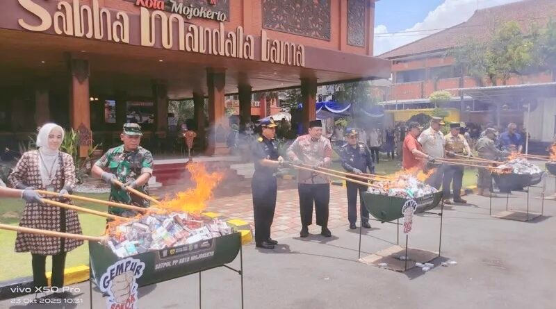 MOJOKERTO – Bea Cukai Sidoarjo bersama Pemerintah Kota (Pemkot) Mojokerto memusnahkan 4.966.768 batang rokok ilegal hasil penindakan terhadap Barang Kena Cukai (BKC) ilegal, Kamis (23/10/2025), di Balai Kota Mojokerto.