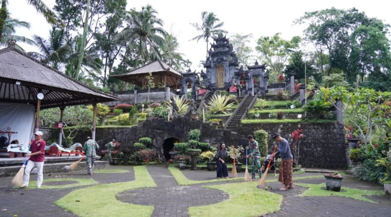 Dengan penuh semangat, para prajurit bahu-membahu bersama warga membersihkan halaman, area tempat ibadah, hingga lingkungan sekitar pura. Upaya tersebut dilakukan untuk memastikan tempat suci tetap bersih, asri, dan nyaman digunakan umat Hindu dalam beribadah.