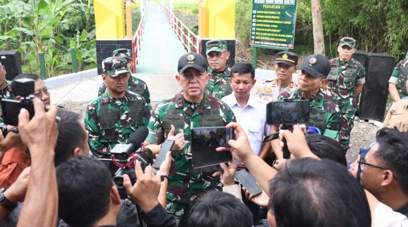 NGANJUK – Pangdam V/Brawijaya Mayjen TNI Rudy Saladin meninjau jembatan kabel pancang yang baru selesai dibangun di Desa Bagorwetan, Kecamatan Sukomoro, Kabupaten Nganjuk, Kamis (5/3/2026).
