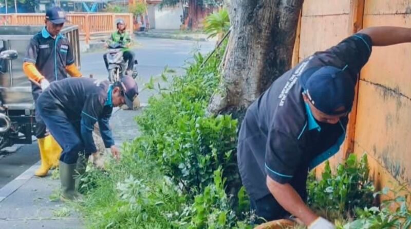 Tim Kebersihan Babat Rumput di Pintu Keluar Terminal Kalideres